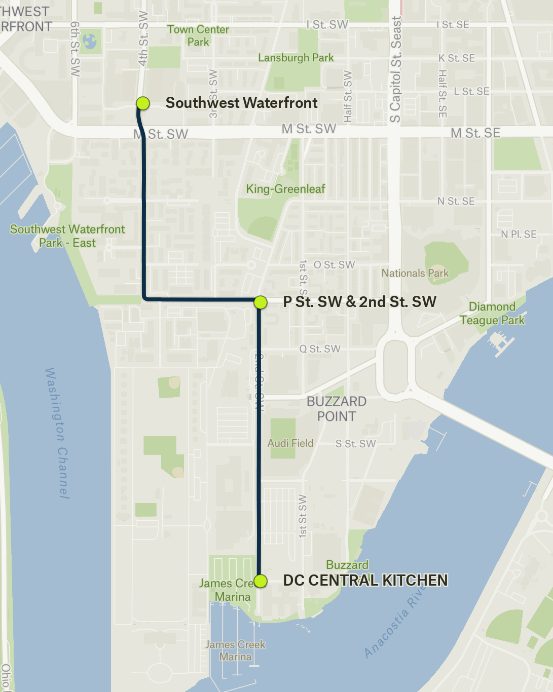 There will be one fixed route called the Buzzard Point Circuit. This Circuit loops between the following stops: