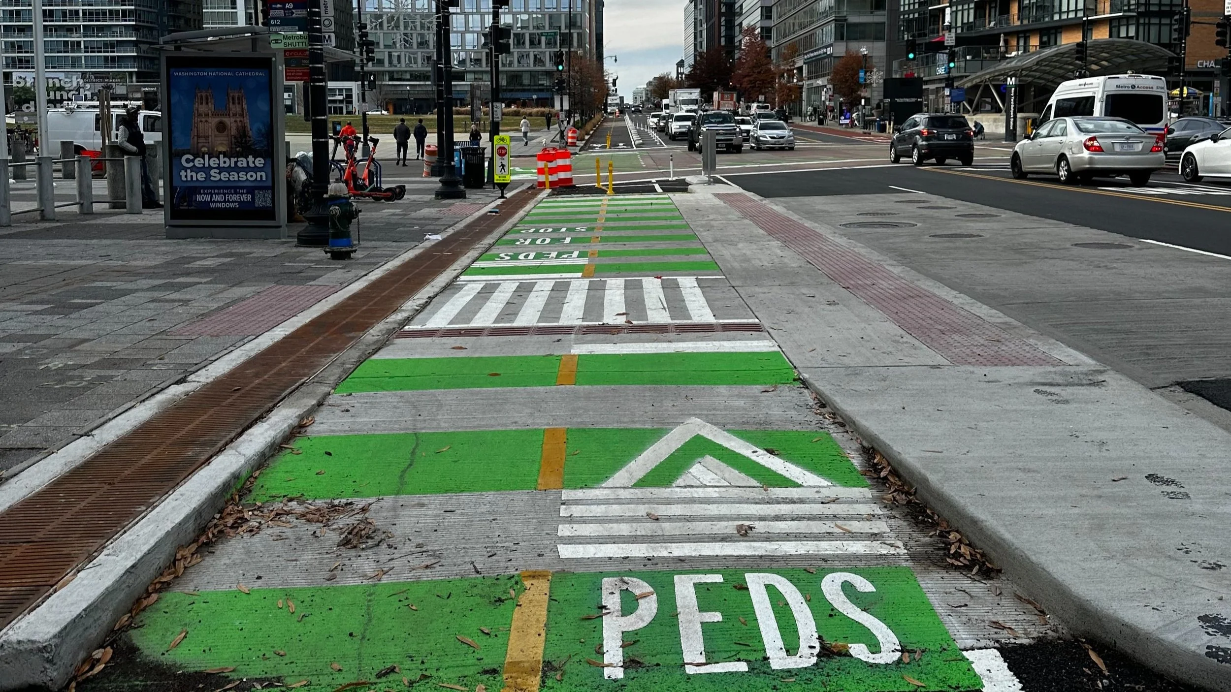 DDOT installed bus lanes on M Street SE as a pilot program to allow for more physical space during COVID-19 as part of a grant to CRBID for the Non-Automotive Mobility Planning Project. The selected plan includes a protected bike lane, shared bus and bike platforms, a bus stop island, and improvements to the median.